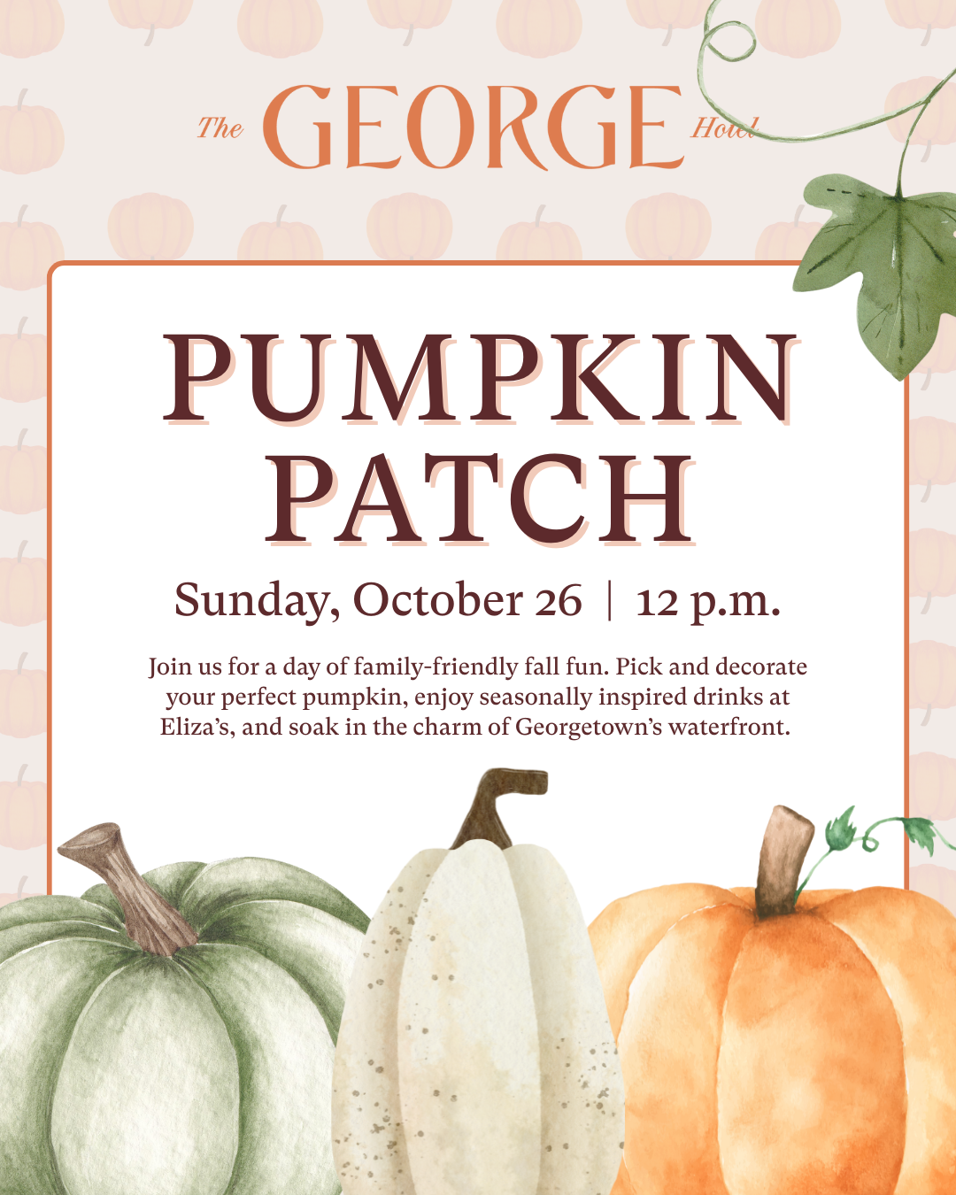 Enjoy seasonal fun atThe George Hotel in Georgetown during a family-friendly Pumpkin Patch on Sunday, Oct. 26 at 12 p.m. Suited for all ages and open to the public, attendees can enjoy waterfront views, pumpkin decorating, autumnal cocktails and plenty of fall fun.
