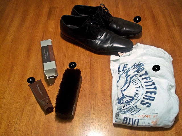 1. Shoes~Banana Republic, 2.Shoe Cream~Johnston & Murphy, 3. 100% Horsehair Brush~Johnston & Murphy, 4. Cloth/Old T-shirt~American Eagle |