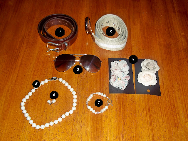 A simple (1) brown leather belt that goes with everything is always key. This (2) nylon belt has a smart stripe running along the middle and helps keep it interesting. (3) Aviators have been relevant for over 50 years. There's a good reason why. I'm going to go out on a limb and say they're going to be relevant for the next 50 years as well. (4) Hair accessories are a nice touch just so long as you do it in moderation. Your hair doesn't need to look like a garden. The best way to keep down on clutter is to bring one set of (5,6,&7) jewelry that can be dressed up or down. It's less thought and less effort. Remember, focus your energy on enjoying your weekend, not which earrings go best with your shoes.