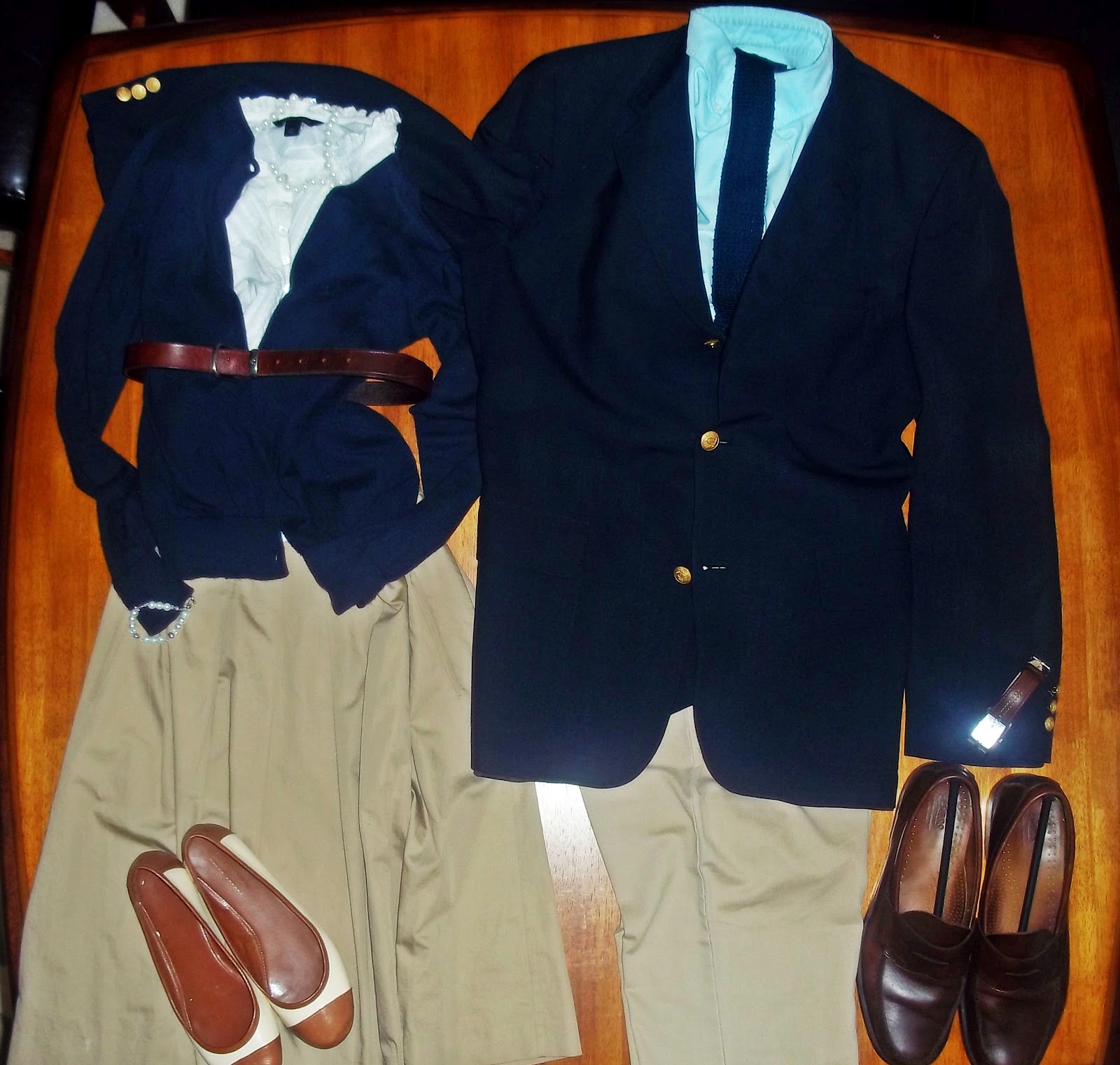 Just like what I said for the men, ladies should bring a (1) striped tshirt. This one has a v-neck just for a little added touch. And don't forget a (2) simple polo. Remember, it can be virtually any color you want. As long as its slim and solid, you've got the green light from me. Next up is this (3) white eyelet blouse. Its a great feminine piece and because it's sleeveless, it allows you to feel the breeze. Lastly, whenever the breeze gets to be a little too much for you, just throw on this (4) light button-down sweater. Make sure it's a color that goes with all of your tops. This navy color is perfect. But you could try a grey, white, or maybe even a faded red could work.
